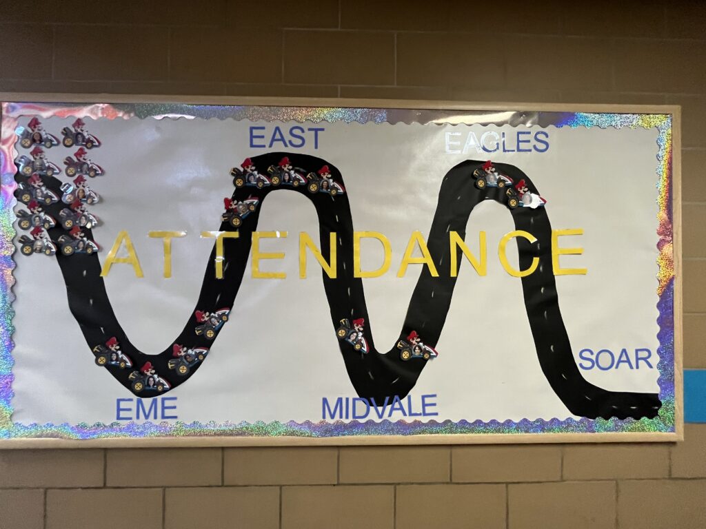 Just across from our posted academic goal boards is our Attendance tracking board. Each class has a Mario Cart that travels the track by spelling EME East Midvale Eagles Soar. A class earns a letter each day that there is 95% or more of the students in attendance. Currently Ms. Gillis’ 2nd grade class won the first lap and will start again with a new character in the cart with Mario!