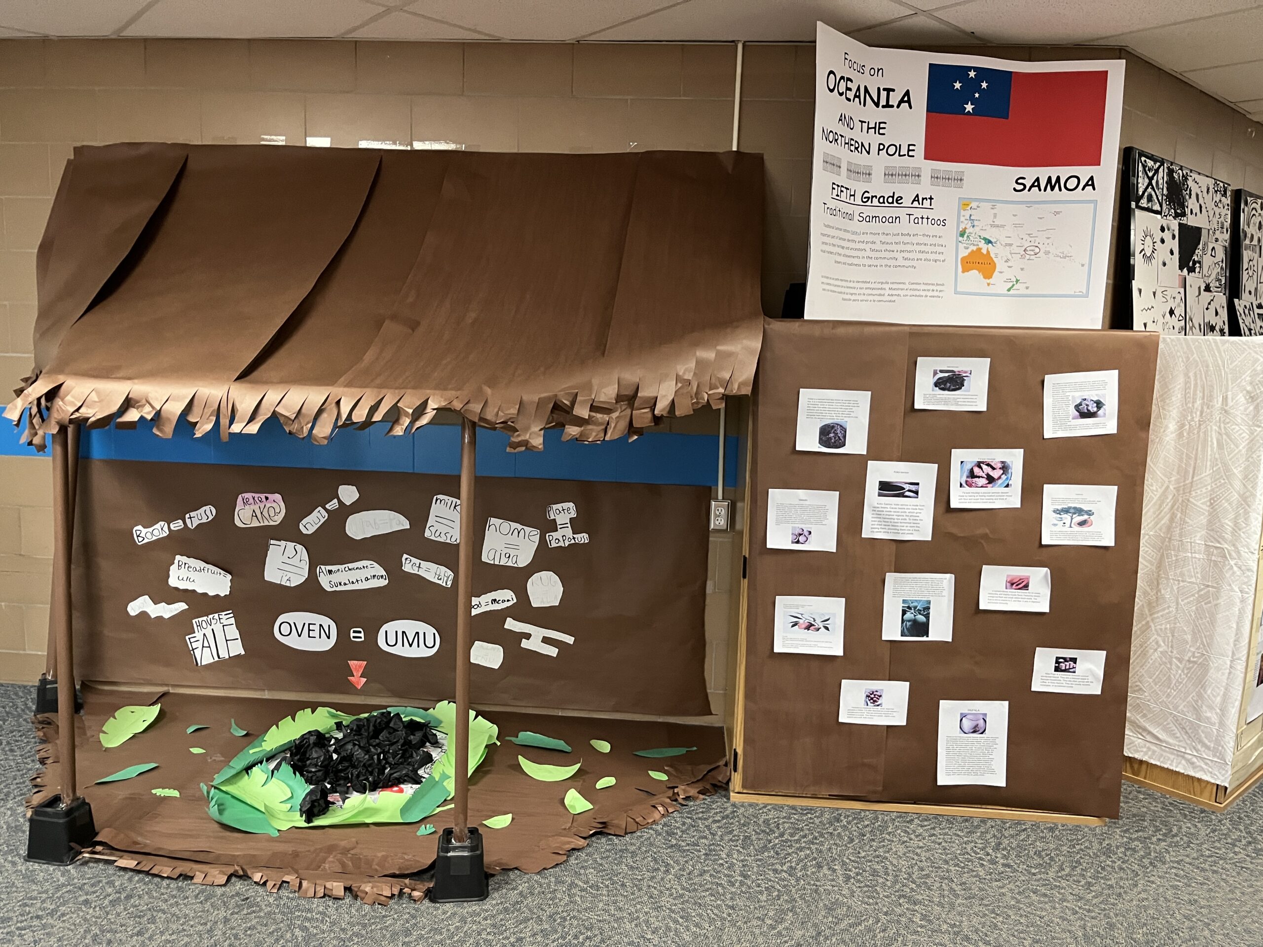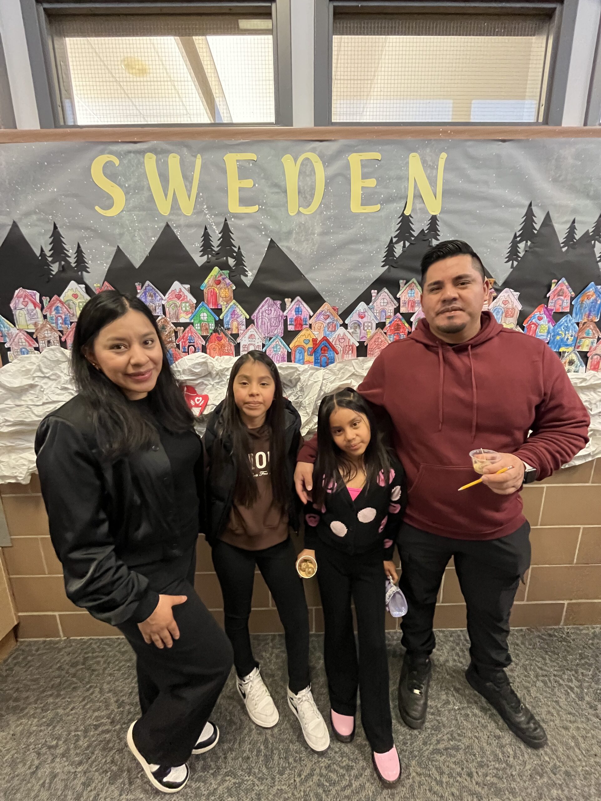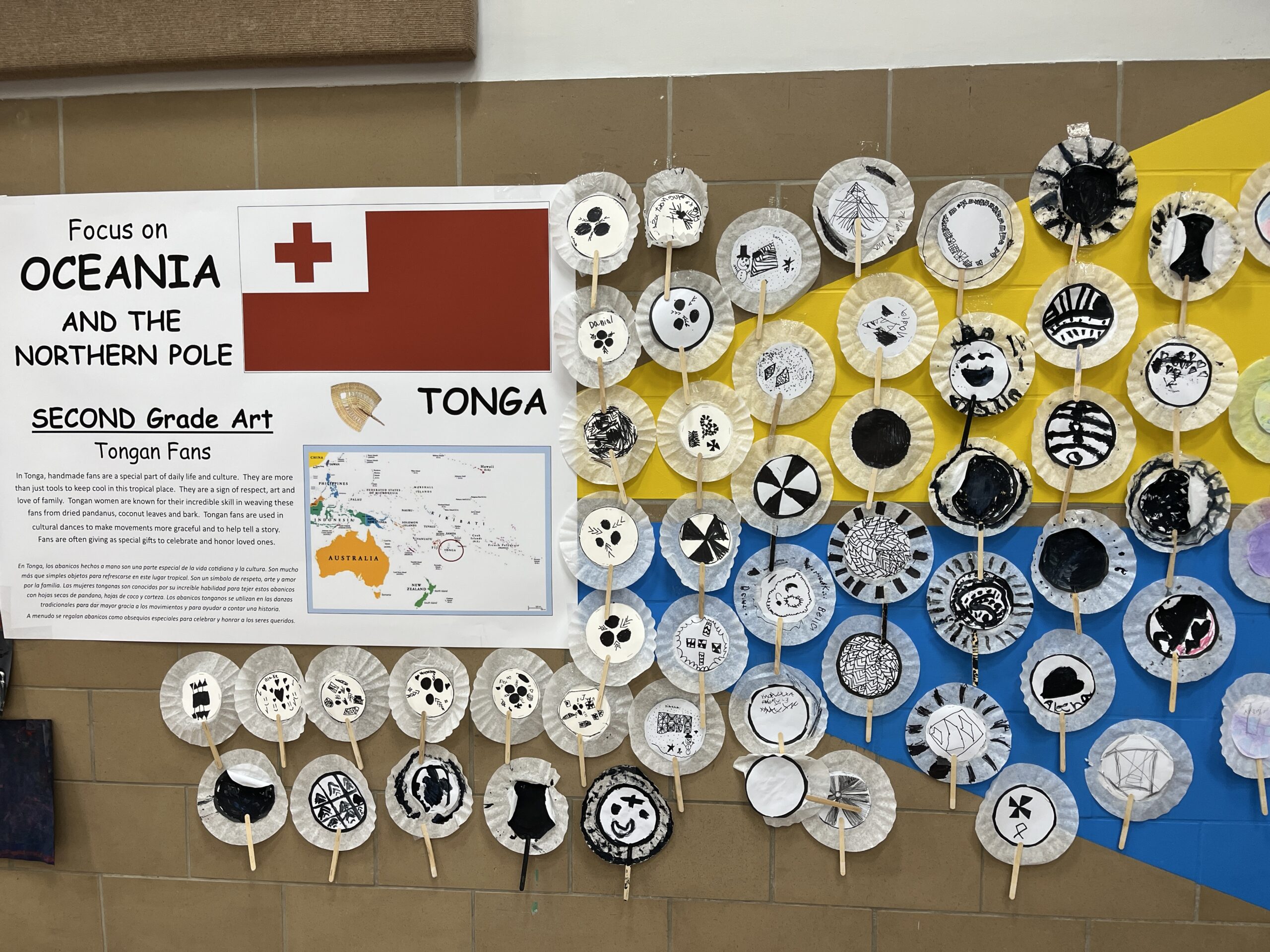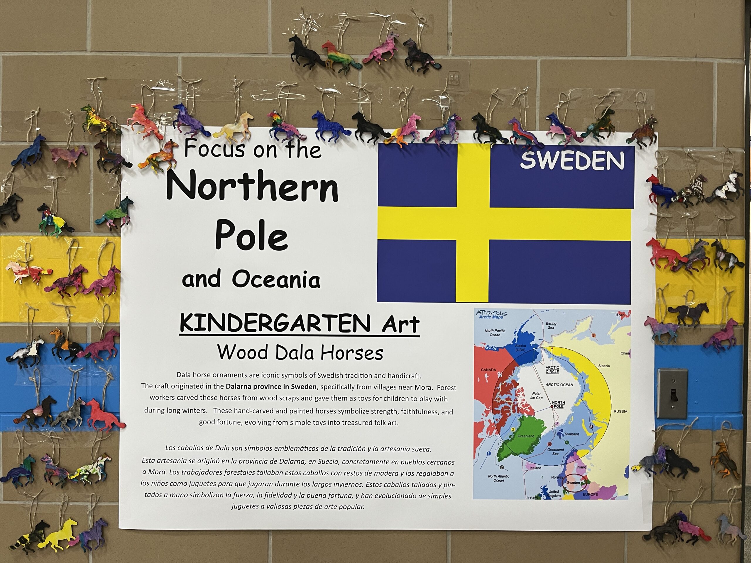 In the gym, music from our focus countries played while families viewed art projects that decorated the walls. Viewing included Dala horses from Sweden (K), Sealife in the Marshall Islands (1st), Tongan fans (2nd), aurora borealis chalkings (3), Ice Castles in Greenland (4th) and Samoan Tataus (5th).