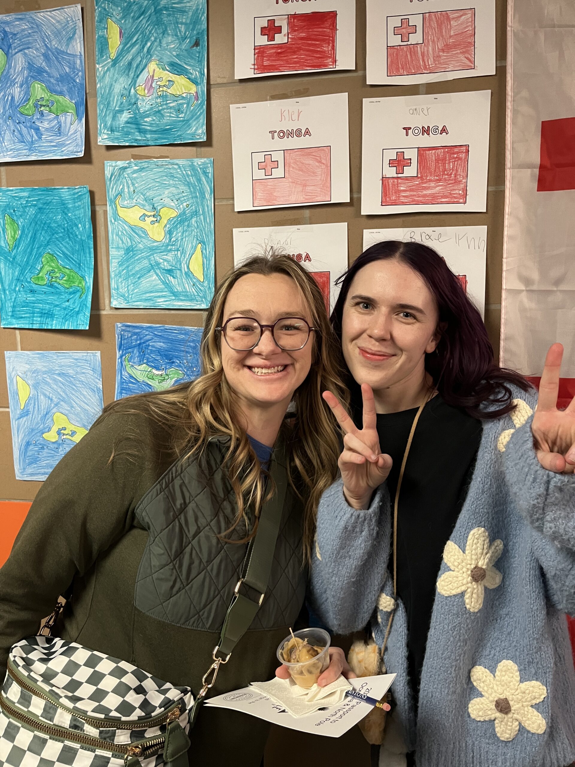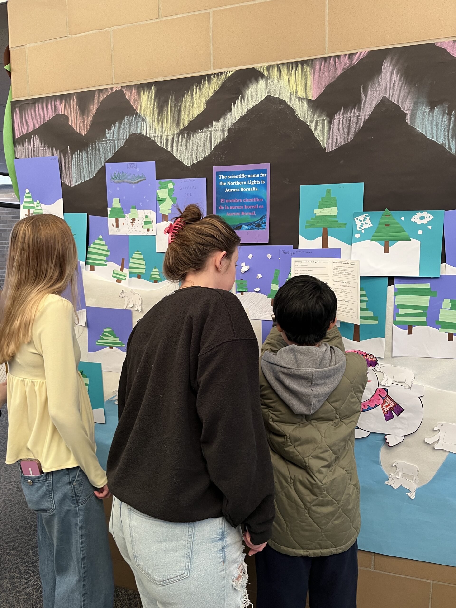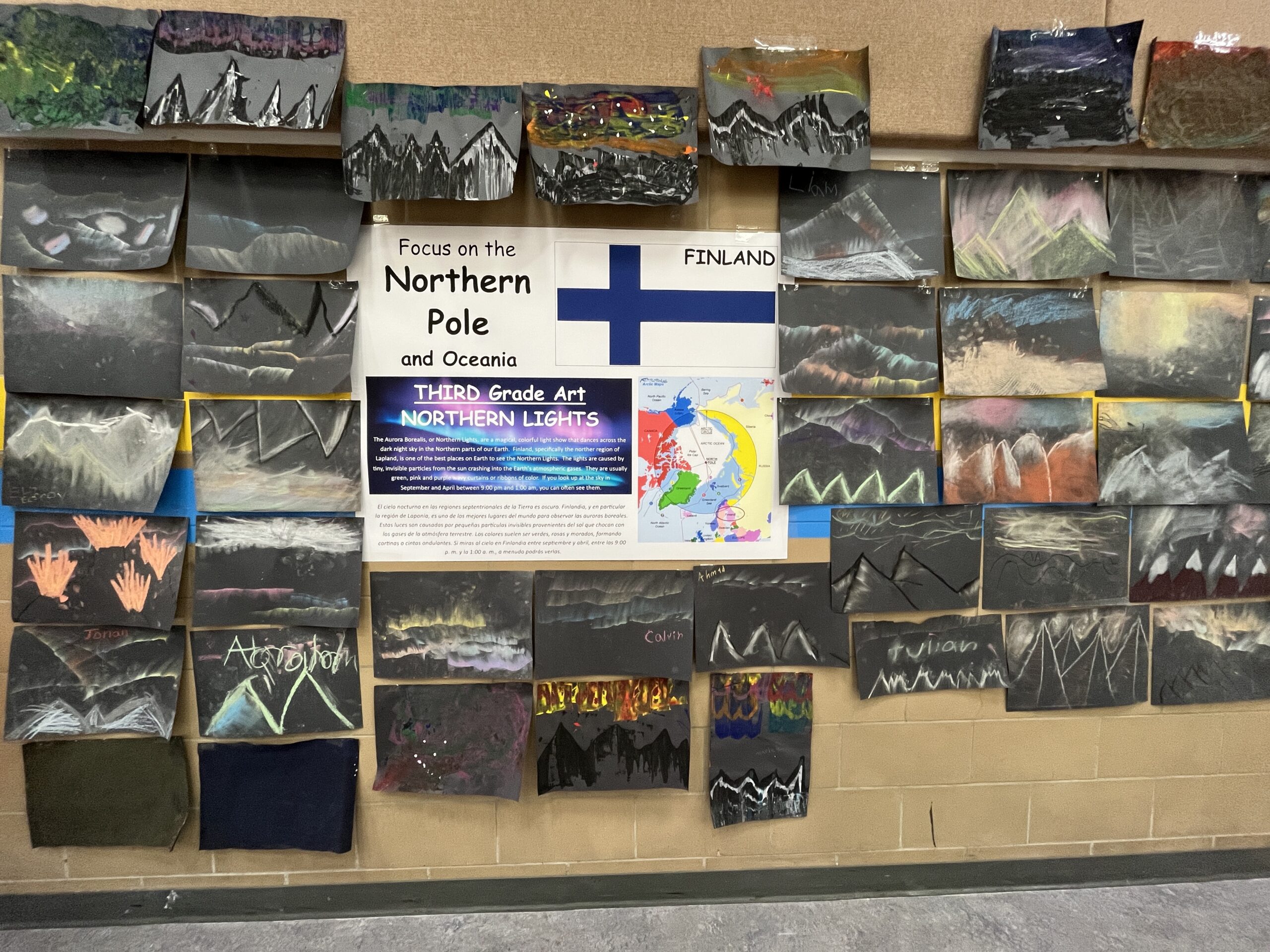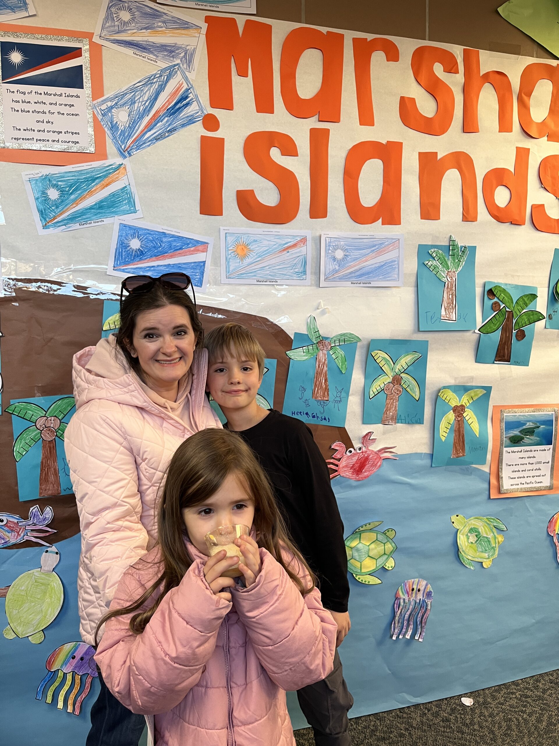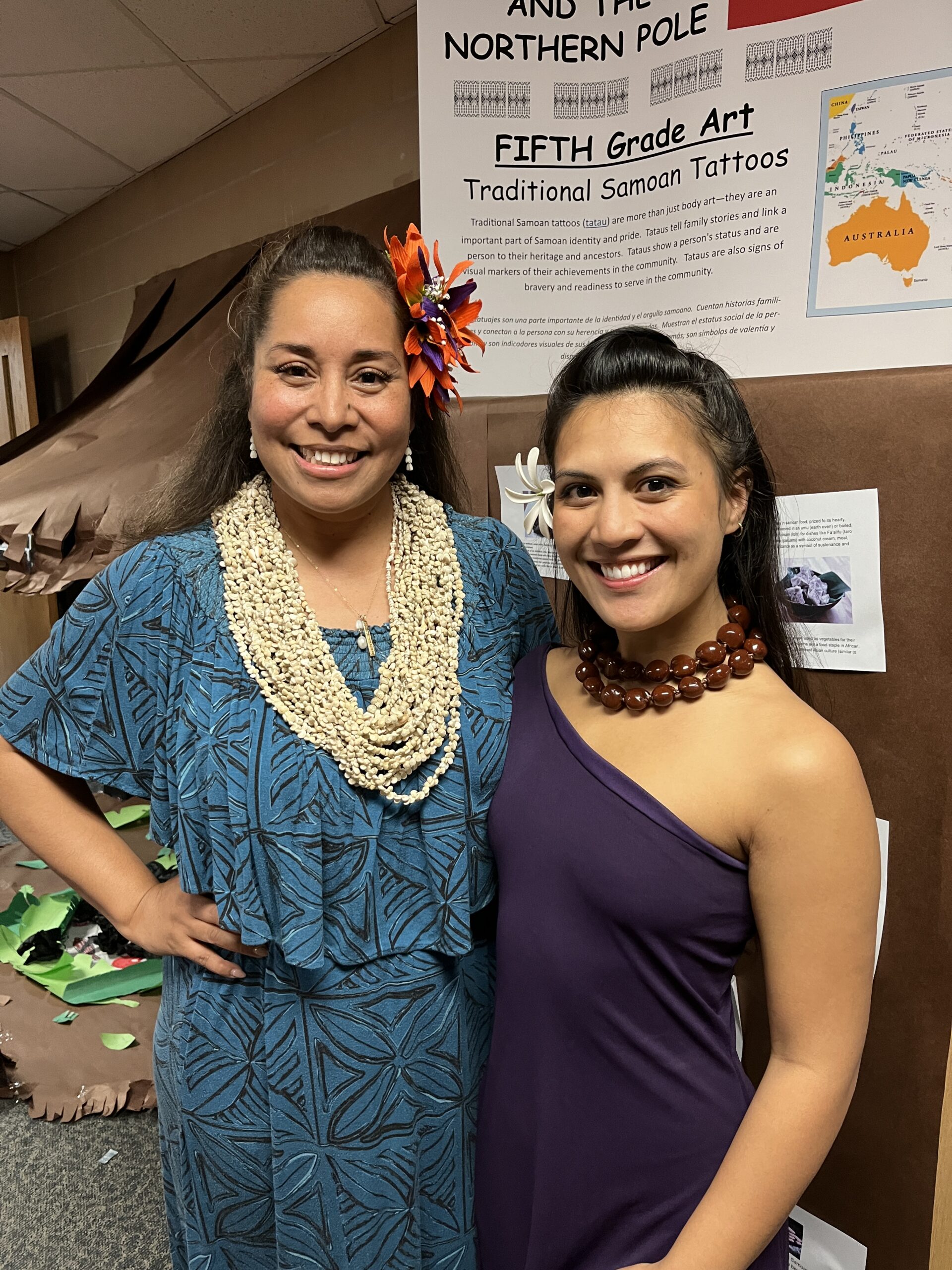 In the gym, music from our focus countries played while families viewed art projects that decorated the walls. Viewing included Dala horses from Sweden (K), Sealife in the Marshall Islands (1st), Tongan fans (2nd), aurora borealis chalkings (3), Ice Castles in Greenland (4th) and Samoan Tataus (5th).