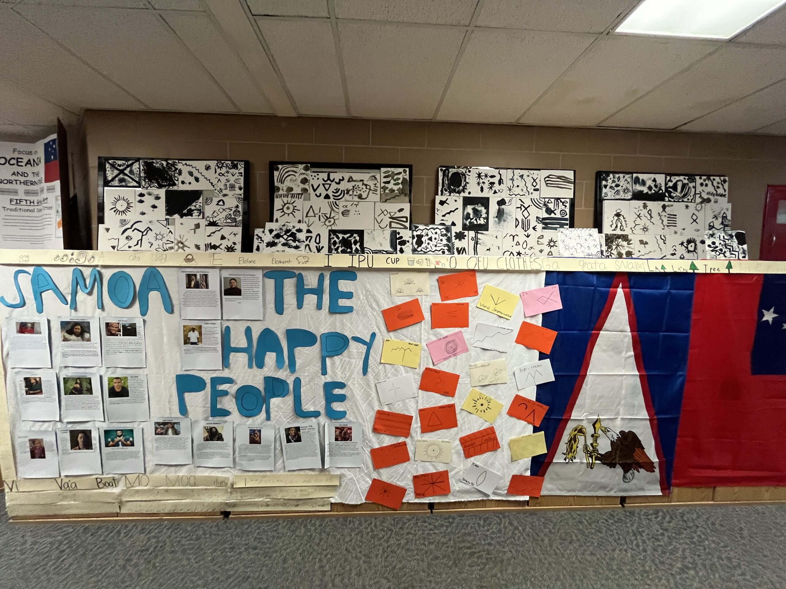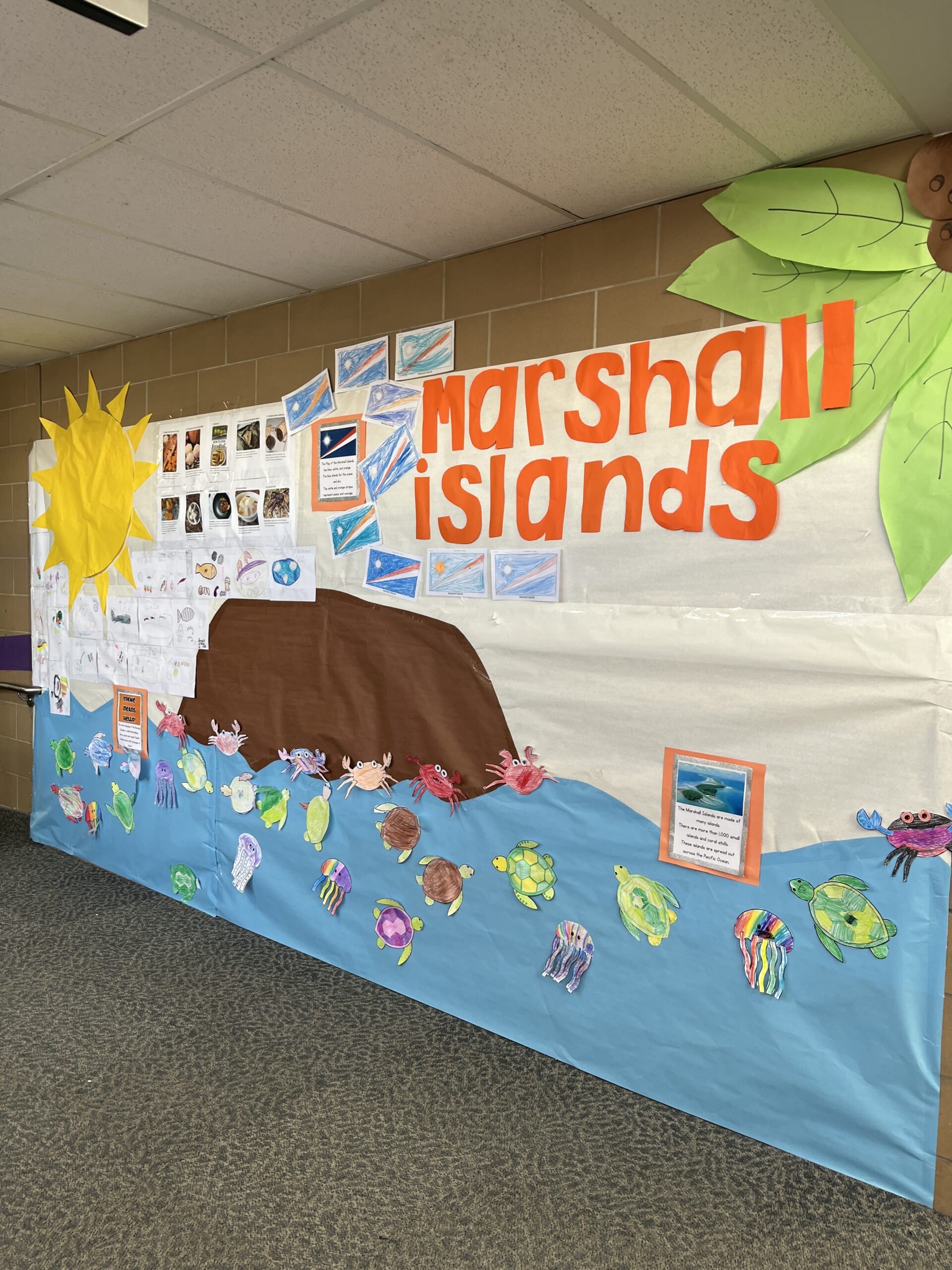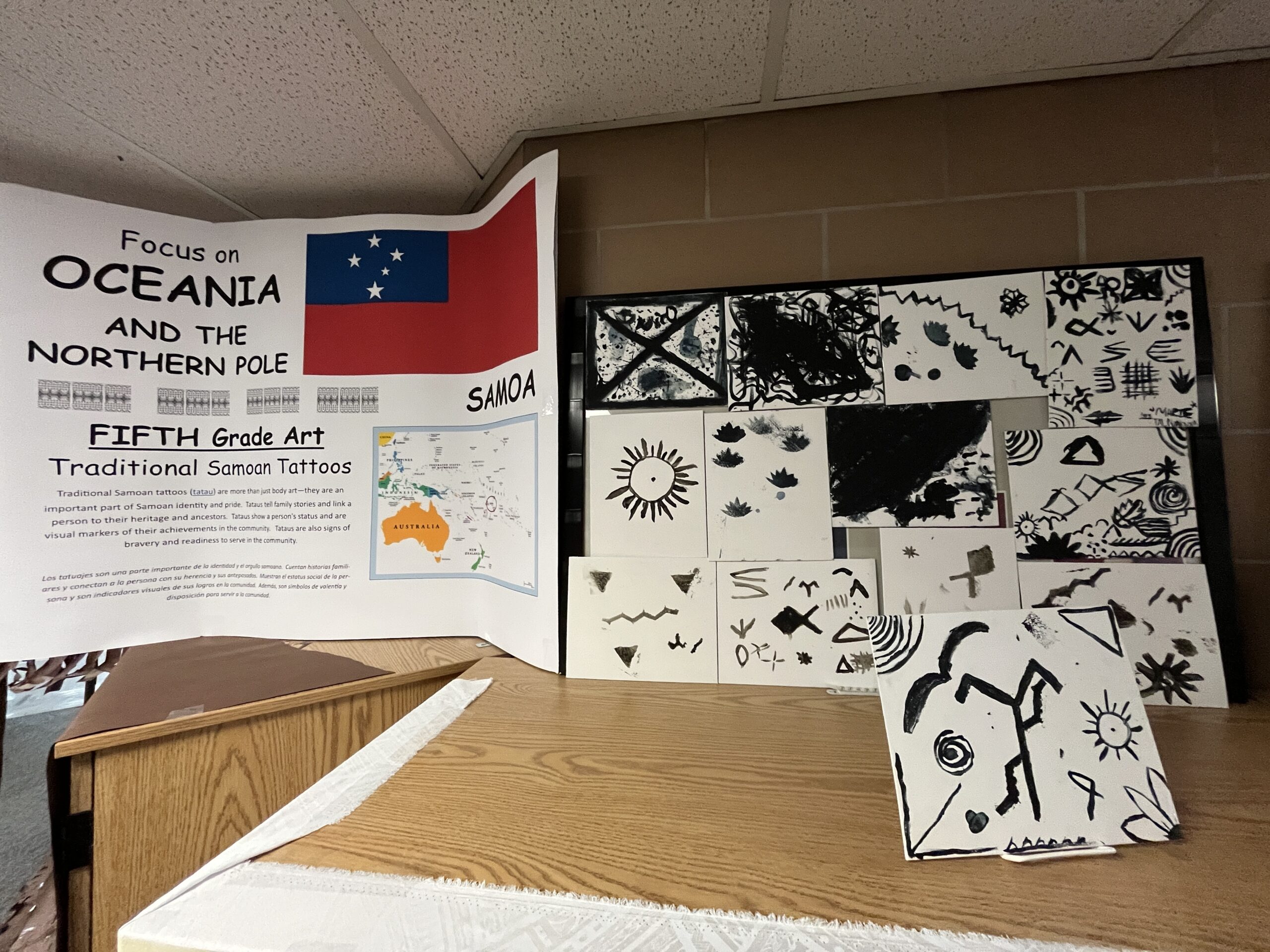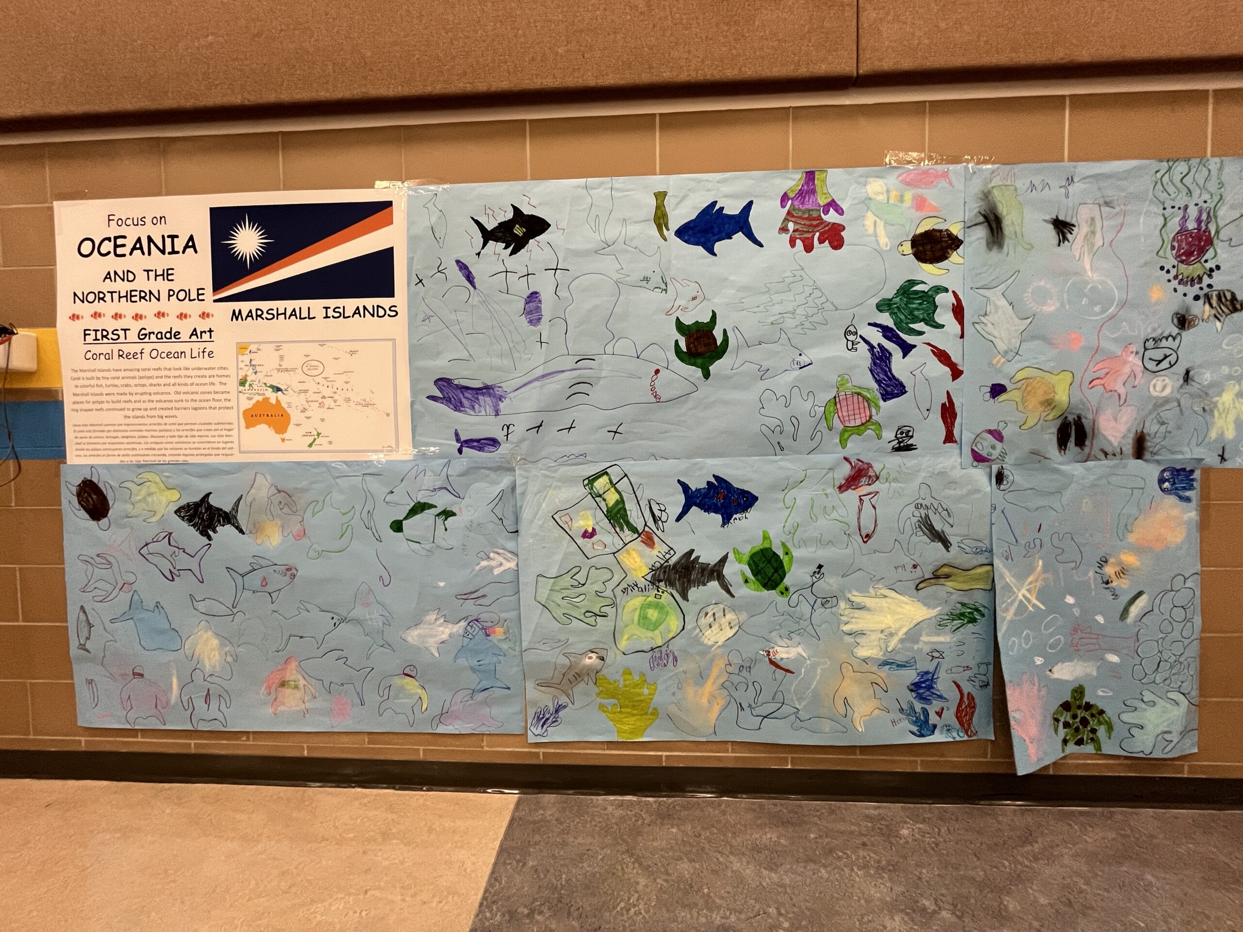 In the gym, music from our focus countries played while families viewed art projects that decorated the walls. Viewing included Dala horses from Sweden (K), Sealife in the Marshall Islands (1st), Tongan fans (2nd), aurora borealis chalkings (3), Ice Castles in Greenland (4th) and Samoan Tataus (5th).